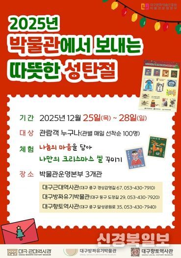 [ 신경북일보 ] 대구문화예술진흥원 박물관운영본부 소속 대구 시립 3개 박물관(대구근대역사관·대구방짜유기박물관·대구향토역사관)에서는 성탄절을 맞아, 12월 25일부터 28일까지 관람객을 대상으로 ‘2025년 박물관에서 보내는 따뜻한 성탄절 –나만의 크리스마스 씰 꾸미기-’ 문화행사를 진행한다.