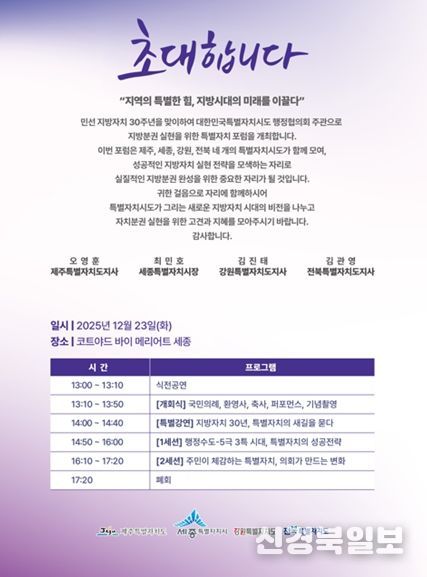 [ 신경북일보 ] 강원특별자치도는 12월 23일 코트야드 바이 메리어트 세종에서 강원, 제주, 세종, 전북 4개 특별자치시도지사들이 모여 대한민국특별자치시도 행정협의회 두 번째 정기회의를 개최했다.