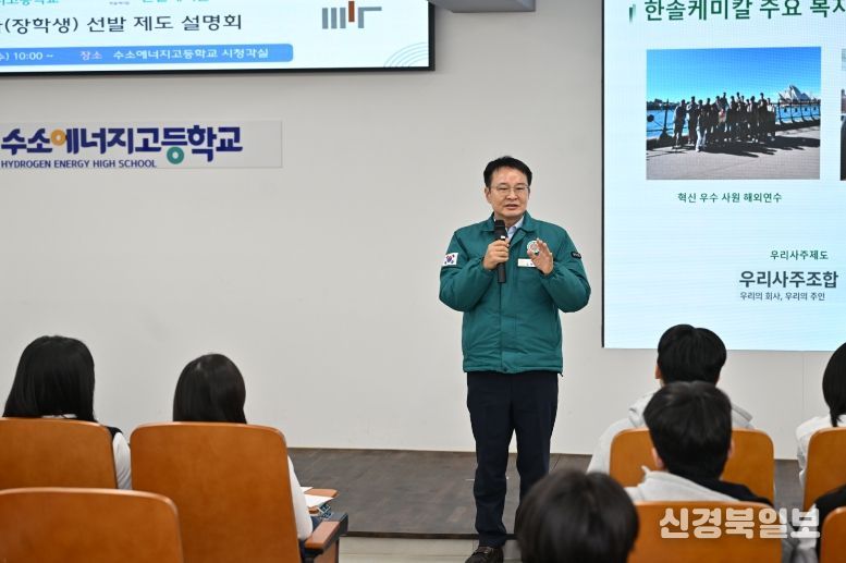 [ 신경북일보 ] 완주군의회 김재천 부의장이 지난 24일 수소에너지고등학교에서 실시된 채용 후보자(장학생) 선발 제도 설명회에 참석해 수소고등학교 학생들을 격려하고, 수소에너지고등학교 교장과 한솔케미칼 관계자 등과 함께 취업 연계방안에 대해 논의를 이어갔다.