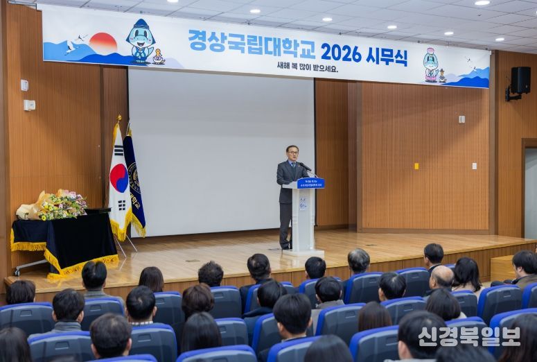 [ 신경북일보 ] 경상국립대학교는 1월 2일 오전 11시 가좌캠퍼스 박물관 대강당에서 2026년 시무식을 개최했다. 시무식은 개식, 국민의례, 총장 신년사, 시상식, 폐식, 기념촬영의 순으로 진행됐다.