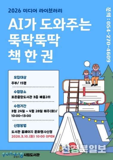 신청은 10일 오전 10시부터 포항시립도서관 홈페이지 문화행사신청 코너에서 선착순으로 받는다. 자세한 내용은 도서관 홈페이지나 포은중앙도서관 사서팀에 문의할 수 있다.