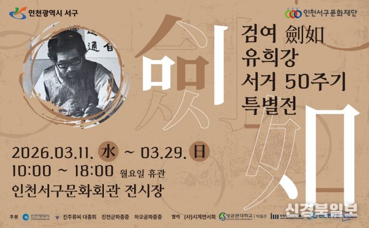 [ 신경북일보 ] (재)인천서구문화재단은 오는 3월 11일부터 3월 29일까지 인천서구문화회관 전시장에서 ‘검여 유희강 선생 50주기 기념 특별전’을 개최한다.