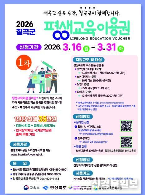 [ 신경북일보 ] 칠곡군이 저소득층, 노인, 장애인 등 교육 소외계층 221명을 대상으로 2026년 평생교육이용권 지원사업 참여자를 모집한다.