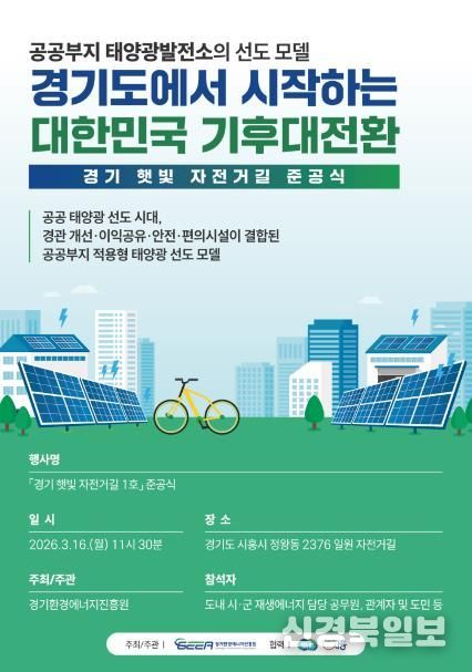 [ 신경북일보 ] 경기환경에너지진흥원은 16일 시흥시 정왕동 2376일원 자전거길에서 ‘경기 햇빛 자전거길 1호’ 준공식을 개최한다고 13일 밝혔다.