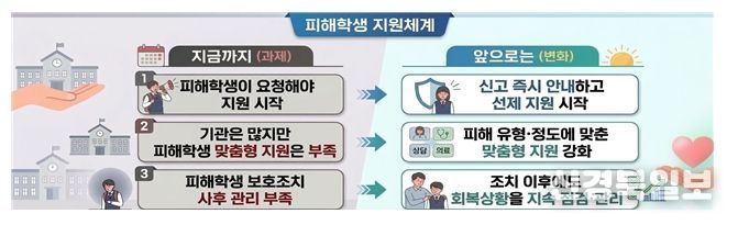 피해학생 관점에서 지원 체감도를 높이기 위해 사안처리 전 과정에서 피해학생 지원 체계를 재정비한다. 이전에는 피해학생과 학부모가 지원받을 수 있는 서비스를 찾아다녔다면, 앞으로는 학교폭력 신고·접수 시 학교장이 피해학생에게 지원 가능한 서비스, 보호조치와 절차를 신속하게 안내하도록 제도를 개선할 예정이다.