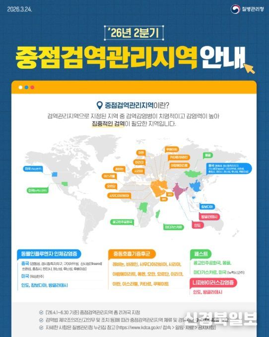[ 신경북일보 ] 질병관리청은 해외감염병 발생 동향과 위험평가를 바탕으로 2분기 중점검역관리지역과 검역관리지역을 지정·해제하고, 4월 1일 자로 시행한다.