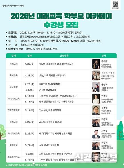 [ 신경북일보 ] 경상북도교육청 울진도서관이 4월 22일부터 6월 10일까지 매주 화요일과 수요일에 '미래교육 학부모 아카데미'를 진행한다.