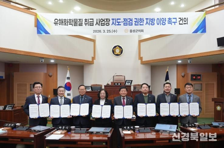 [ 신경북일보 ] 음성군의회는 3월 25일 제387회 임시회 제5차 본회의에서 ‘유해화학물질 취급 사업장 지도·점검 권한 지방 이양 촉구 건의문’을 채택하고, 군민의 생명과 안전을 지키기 위한 제도 개선을 정부와 국회에 촉구했다.