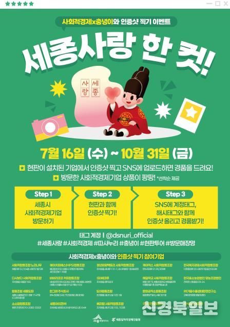 [ 신경북일보 ] 세종일자리경제진흥원은 세종시 사회적경제기업에 대한 시민의 관심과 참여를 높이기 위해 ‘세종사랑 한 컷! SNS 인증샷 이벤트’를 진행한다.