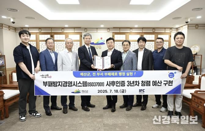[ 신경북일보 ] 예산군이 직속기관, 사업소 및 읍면을 포함한 전 부서의 부패방지경영시스템(국제표준화기구 37001, ISO 37001) 인증을 성공적으로 유지하며, 청렴도 최우수 지방자치단체로서의 위상을 공고히 했다.