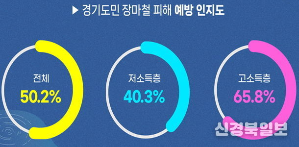 [ 신경북일보 ] 경기도민의 절반은 장마철 피해를 어떻게 예방하고 대처해야 하는지 모른다는 조사결과가 나왔다. 소득 수준에 따라 정보 접근 격차도 커, 저소득층인지도는 고소득층보다 25.5%포인트 낮았다.