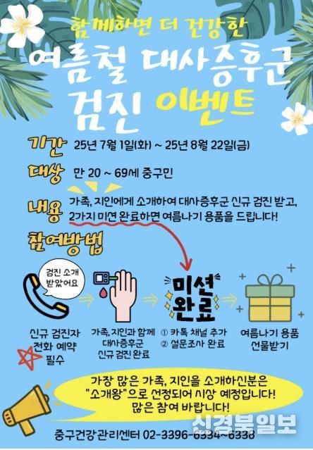 [ 신경북일보 ] 서울 중구가 이번 여름 가족, 지인과 함께 무료로 대사증후군 검진을 받으면 선착순 300명에게 여름나기 용품을 선물로 제공하는 이벤트를 진행한다.