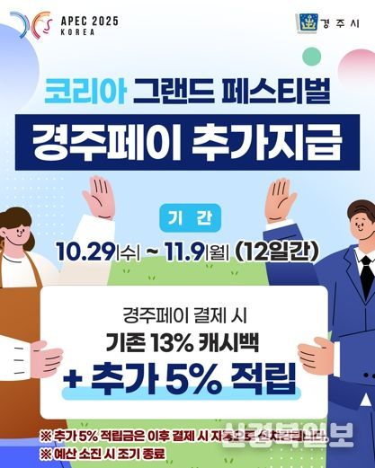 [ 신경북일보 ] 경주시가 29일부터 다음달 9일까지 열리는 ‘코리아 그랜드 페스티벌’ 기간 지역화폐 ‘경주페이’ 이용자에게 기존 13% 캐시백에 더해 5%를 추가 지급한다고 24일 밝혔다.