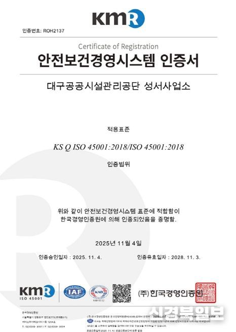 [ 신경북일보 ] 대구공공시설관리공단 성서사업소는 11월 4일, 한국경영인증원이 실시한 안전보건경영시스템 국제표준(ISO45001) 인증 심사에서 ‘적합’ 판정을 받았다.