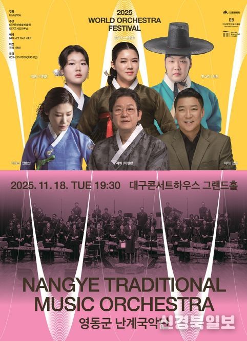 [ 신경북일보 ] (재)대구문화예술진흥원 대구콘서트하우스는 오는 11월 18일 저녁 7시 30분, 그랜드홀에서 ‘2025 월드오케스트라페스티벌’의 특별한 무대로 ‘영동군 난계국악단’의 공연을 개최한다.