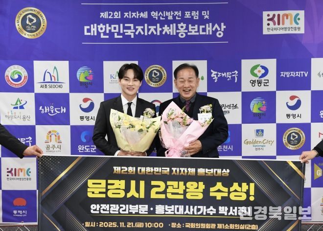 [ 신경북일보 ] 문경시는 11월 21일, 국회의사당 국회의원회관 제1소회의실에서 열린 ‘제2회 대한민국 지자체 홍보대상’ 시상식에서 안전관리부문 대상과 홍보대사대상 특별상을 동시에 수상해 2관왕의 영예를 안았다.