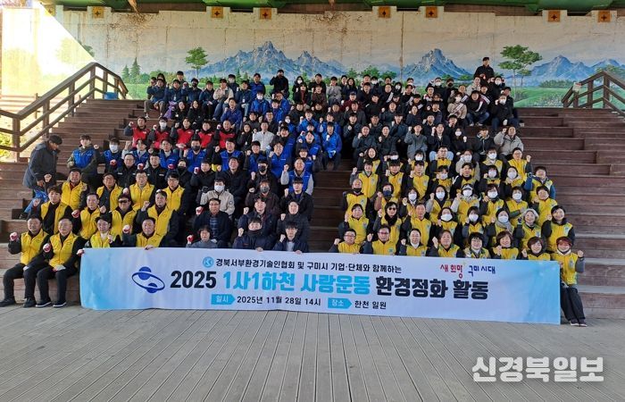 [ 신경북일보 ] 구미시는 지난 28일 양포동 한천 일원에서 ‘2025년 1사1하천 사랑운동’의 일환으로 하천정화활동을 실시했다. 이번 활동에는 구미시가 주관하고 경북서부환경기술인협회 등 27개 기업과 민간단체 임직원 및 회원 등 160여 명이 참여했다.