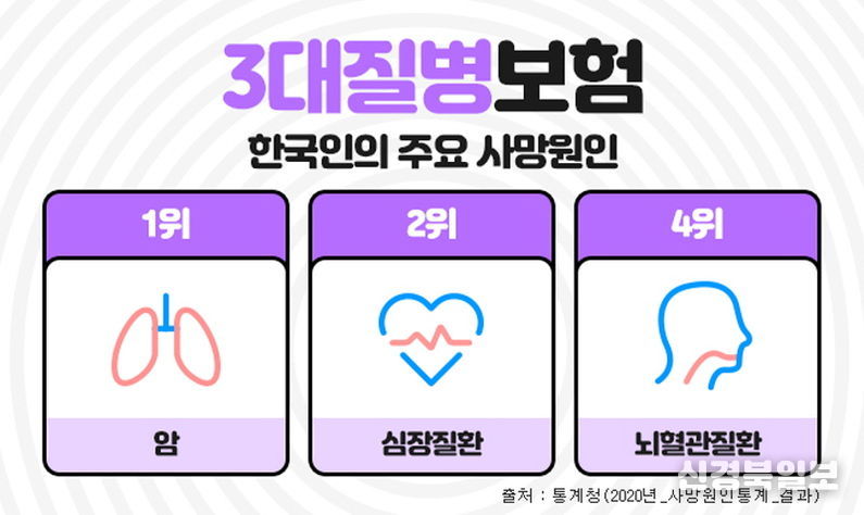 [ 신경북일보 ] 한국인의 주요 사망원인중에 암, 뇌혈관질환, 심혈관질환은 흔히 3대질병이라 일컬어지며 살아가면서 가장 먼저 대비해야 하는 중대질병으로 항상 강조되고 있다. 이들 질병에 미리 대비하기 위해 가입하는 것이 진단비보험인데, 이러한 3대질병진단비를 중점으로 보장하는 보장성보험이 3대진단비보험 이다. 3대질병진단비보험은 각각의 질병에 주목해서 보장하기도 하지만, 나에게 맞는 추가 특약을 잘 골라서 가입한다면 종합건강보험으로도 충분히 활용도가 높다.