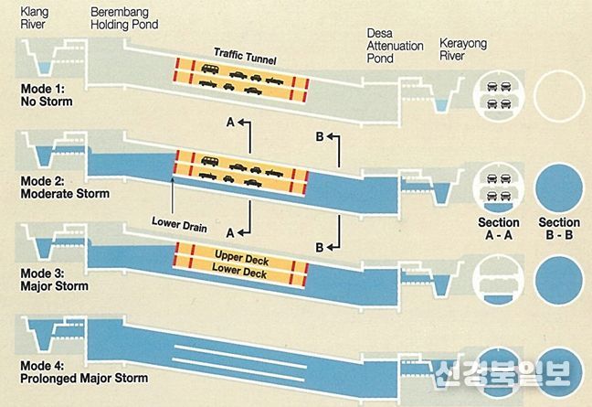 ‘SMART’는 총 4단계로 운영되는데 1단계에는 정상 운행하다가 2단계로 상향되면 도로는 정상 운영하되 하부 빗물 터널에만 물을 담기 시작한다. 3단계에 접어들면 차량 통행을 통제, 4단계가 되면 도로와 빗물 터널 전체를 수로로 활용한다.