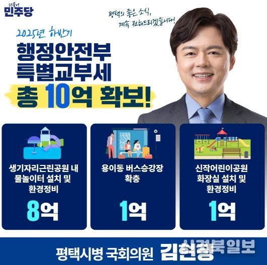[ 신경북일보 ] 김현정 국회의원(평택시병·더불어민주당)은 2025년 하반기 행정안전부 특별교부세 총 10억 원을 확보해, 지역 주민의 생활환경 개선과 안전·편의 증진을 위한 주요 현안 사업을 본격 추진한다고 밝혔다.