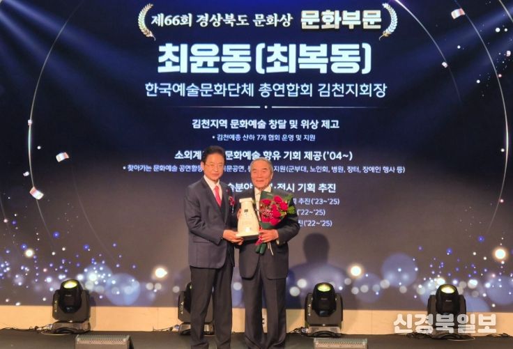 [ 신경북일보 ] 김천시는 지난 23일 안동 스탠포드호텔에서 열린 제66회 경상북도 문화상 시상식에서 최복동 한국예총 김천지회장(문화 부문), 김대철 도문요 대표(시각예술 부문)가 각각 수상했다고 밝혔다.