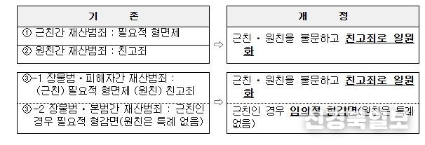 이번 「형법」 개정안에 따르면, ① 친족의 범위를 불문하고 친족간 재산 범죄는 친고죄로 일치시켜 규정하고, ② 장물범과 본범(예:절도범 등) 사이가 근친인 경우 현행 ‘필요적 감면’에서 ‘임의적 감면’으로 개정하며, ③ 근친・ 원친 여부를 불문하고 친고죄로 개정됨에 따라 「형사소송법」 및 「군사법원법」상 고소 제한 규정의 특례를 마련하여 자기・배우자의 직계존속에 대하여도 고소를 할 수 있도록 했다.