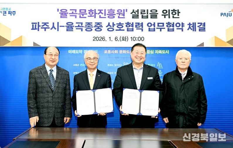 [ 신경북일보 ] 파주시가 율곡 이이 선생의 학문과 철학을 체계적으로 계승하기 위해 추진 중인 ‘율곡문화진흥원’설립을 위해 지난 6일 율곡 선생의 후손인 덕수 이씨 종중과 업무협약을 체결했다.