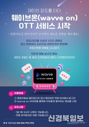 [ 신경북일보 ] 경상북도교육청 의성도서관(관장 이미경)은 오는 13일부터이용자가 필요로 하는 영상을 실시간으로 제공하는 ‘웨이브온 VOD(Video On Demand)’ 서비스를 운영한다고 밝혔다.