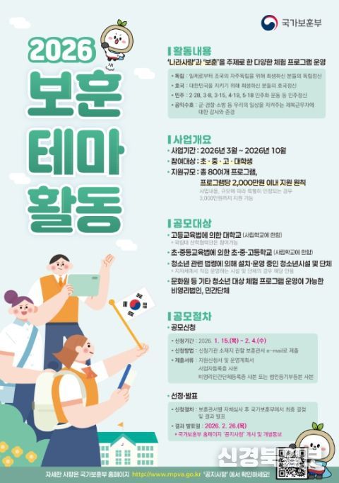 [ 신경북일보 ] 국가보훈부는 전국의 청소년들이 일상에서 쉽고 재미있게 ‘보훈’을 체험하고 이해할 수 있도록 지원하기 위한 ‘2026년 청소년 보훈 테마활동’ 프로그램 공모를 15일부터 2월 4일까지 진행한다고 밝혔다.
