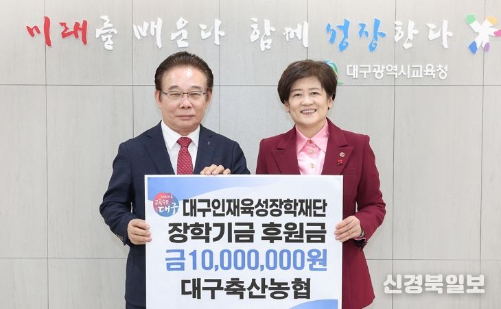 [ 신경북일보 ] 대구시교육청은 1월 16일, 대구축산농협(조합장 최성문)에서 대구인재육성장학재단에 장학금 1천만 원을 기탁한다고 밝혔다.