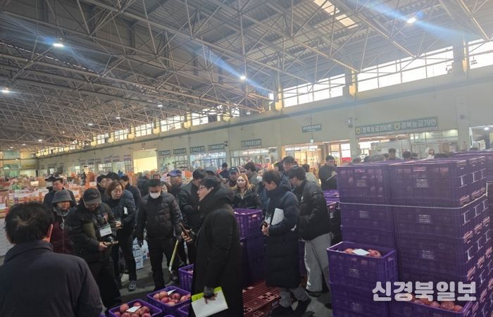이날 경매 현장에는 이현주 농업기술센터소장을 비롯해 대경사과원예농협 포항APC장장, 도매시장 법인대표, 도매시장 및 관계자 등이 참석했다.