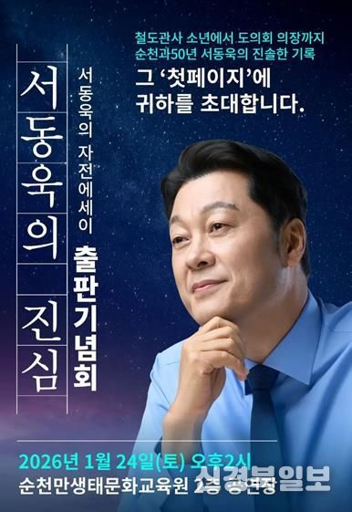 [ 신경북일보 ] 순천에서 나고 자라 삶과 정치를 함께해 온 순천시장 출마 예정자 서동욱 전 전남도의회 의장(더불어민주당, 순천4)이 자전에세이 「서동욱의 진심(부제: 철도관사 소년에서 도의회 의장까지, 순천과 50년)」 출간을 기념해 오는 1월 24일 오후 2시, 순천만생태문화교육원에서 출판기념회를 연다.