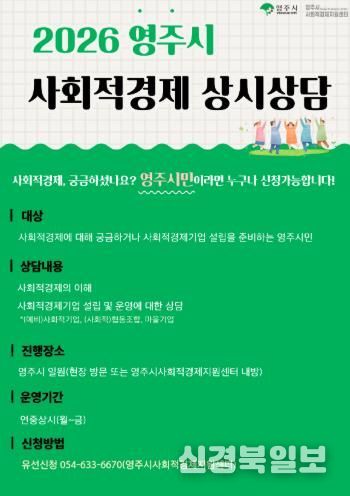 [ 신경북일보 ] 영주시와 영주시사회적경제지원센터는 사회적경제에 대한 시민들의 이해를 높이고 신규 사회적경제기업 발굴을 지원하기 위해 ‘2026 영주시 사회적경제 상시상담’을 연중 운영한다고 밝혔다.