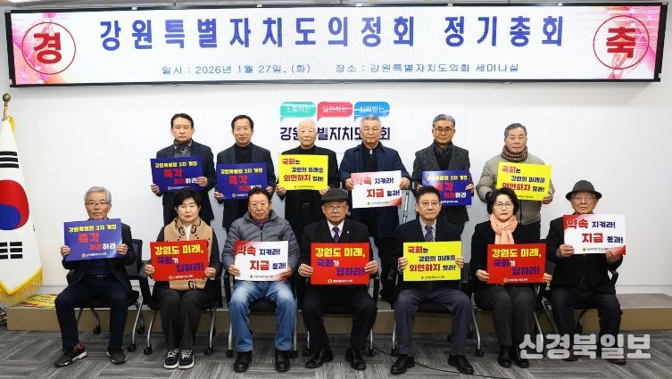 [ 신경북일보 ] 강원특별자치도의정회는 1월 27일 11시.도의회 세미나실에서 2026년도 정기총회를 개최했다. 정기총회를 진행한 가운데 의정회원들이 강원특별법 3차 개정안 심사와 통과 촉구 결의문 낭독과 함께 피켓 퍼포먼즈로 강원특별자치도의 제도적 기반 강화를 위한 의지를 한데 모았다.