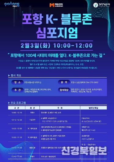[ 신경북일보 ] 포항시는 내달 3일부터 시청 대회의실에서 ‘포항에서 100세 시대의 미래를 열다, K-블루존으로 가는 길’ 심포지엄을 개최한다.
