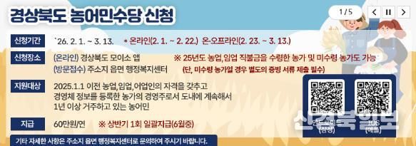 온라인 신청은 2월 1일부터 2월 22일까지 경상북도 공공서비스 플랫폼인 ‘모이소(Moiso)’ 앱을 통해 가능하며, 방문 신청은 2월 23일부터 3월 13일까지 주소지 읍·면 행정복지센터에서 접수할 수 있다.