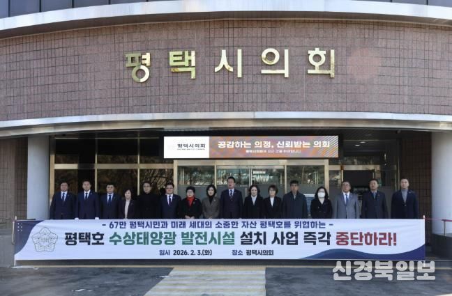 [ 신경북일보 ] 평택시의회는 2월 3일, 시의회 본관 앞에서‘평택호 수상태양광 발전시설 설치 중단 촉구 성명서’를 발표했다.