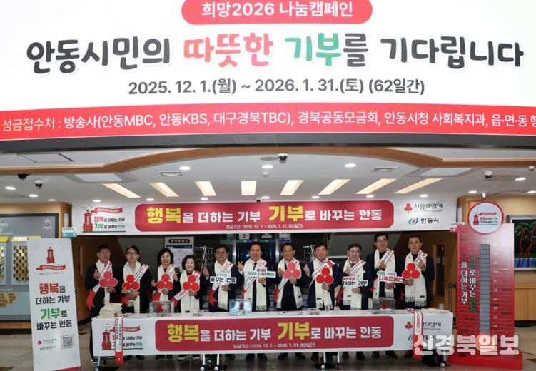 [ 신경북일보 ] 안동시가 ‘행복을 더하는 기부, 기부로 바꾸는 안동’이라는 슬로건으로 2025년 12월 1일부터 2026년 1월 31일까지 총 62일간 실시한 ‘희망2026 나눔캠페인’에서 9억 4천만 원을 모금하며 사랑의 온도 134℃를 기록했다.