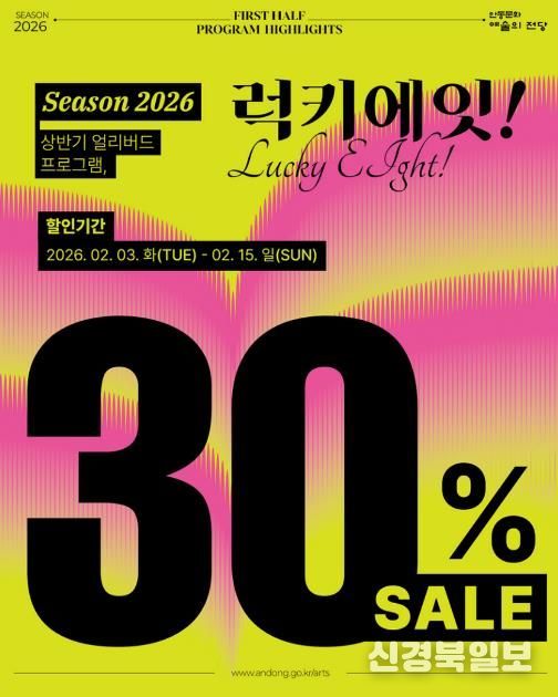 [ 신경북일보 ] 안동문화예술의전당은 상반기 주요 공연을 대상으로 30% 할인 혜택을 제공하는 특별 프로모션 ‘럭키에잇!’을 진행한다고 밝혔다.