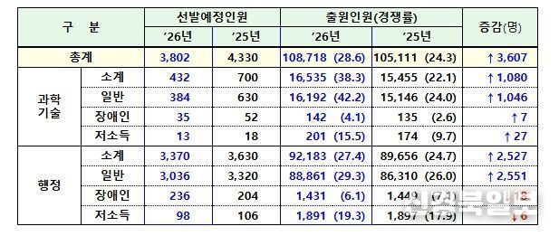 인사혁신처(처장 최동석)는 지난 2~6일 9급 공채 선발시험 응시원서를 접수한 결과 선발 예정 인원 3,802명에 10만 8,718명이 지원해 평균 28.6대 1의 경쟁률을 보였다고 7일 밝혔다.