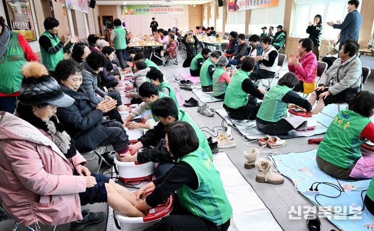 [ 신경북일보 ] 군위군새마을회(회장 박택관) 산하 직장공장새마을운동군위군협의회(회장 김천일)는 9일 오후, 효령면행정복지센터에서 지역 어르신 60여 명을 모시고‘찾아가는 공경문화 족욕봉사’를 실시했다.