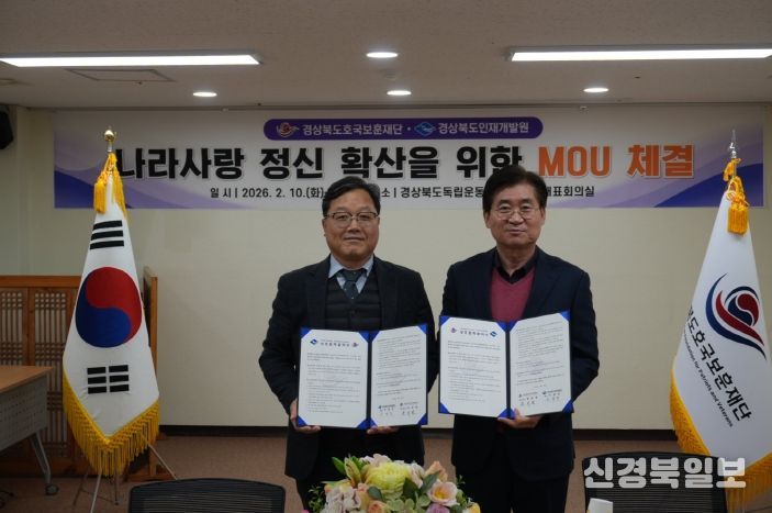 [ 신경북일보 ] 경상북도인재개발원(원장 우광진)과 (재)경상북도호국보훈재단(대표이사 한희원)은 2월 10일 오후 2시, (재)경상북도호국보훈재단 국민대표회의실에서 나라사랑 정신을 계승·확산하기 위한 업무협약(MOU)을 체결했다.