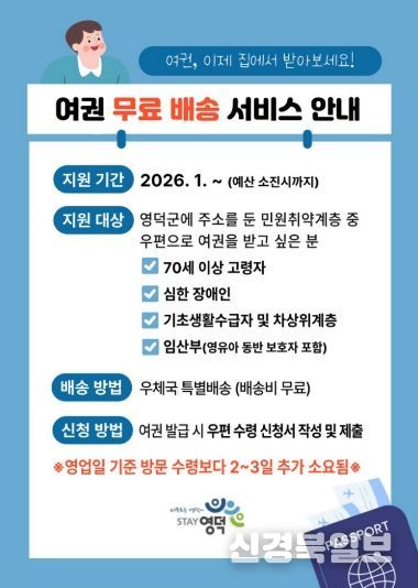 [ 신경북일보 ] 영덕군은 민원 취약계층의 행정 접근성을 높이고 주민 편의를 증진하기 위해 올해부터 ‘여권 무료 배송서비스’를 시행하고 있다.