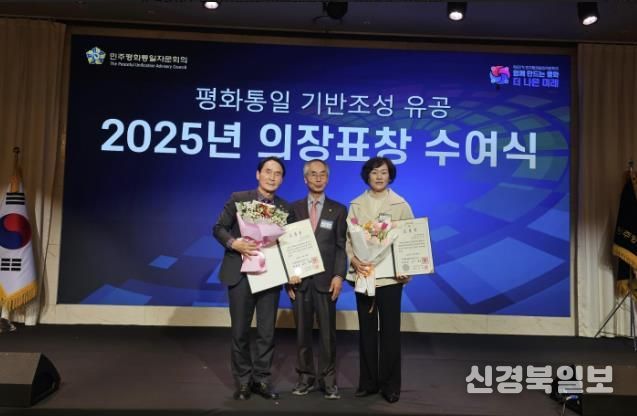 [ 신경북일보 ] 민주평통 문경시협의회 천금선 부회장과 박인국 자문위원은 11일 안동 스탠포드호텔에서 열린 ‘2025년 민주평화통일자문회의 표창 수여식’에서 의장(대통령) 표창을 수상했다.