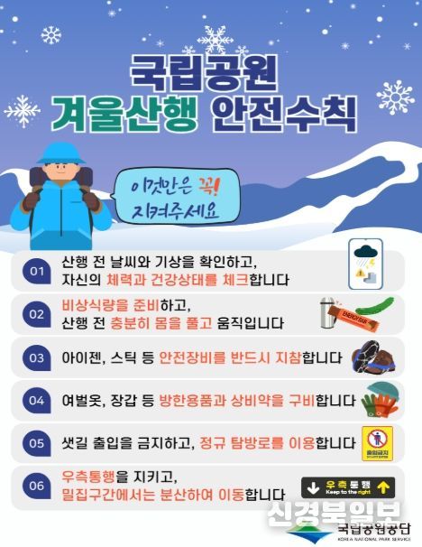 [ 신경북일보 ] 기후에너지환경부 산하 국립공원공단(이사장 주대영)은 2월 14일부터 18일까지 설 연휴 탐방객 안전관리 대책 기간으로 지정하고, 국립공원 주요 지역 1,544곳에 인력 4,833명을 집중 배치해 탐방객의 생명과 안전을 지키기 위한 현장 대응을 대폭 강화한다고 밝혔다.