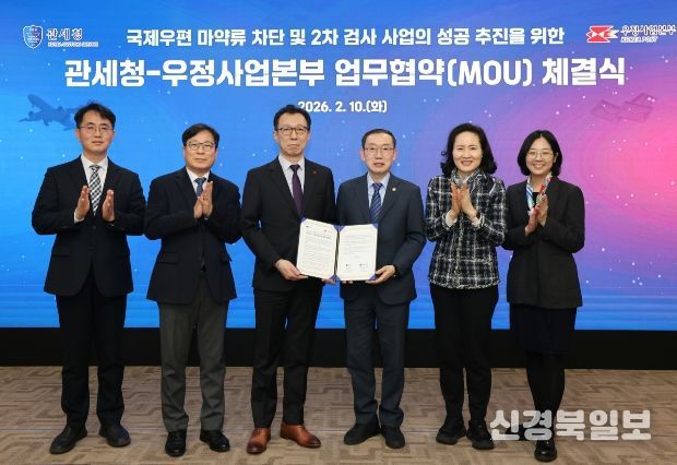 [ 신경북일보 ] 관세청과 과학기술정보통신부 우정사업본부(본부장 직무대리 곽병진)는 2월 10일 서울세관에서 국제우편을 통한 마약류 반입을 원천 차단하기 위해 '국제우편 마약류 차단 및 2차 검사 사업의 성공 추진을 위한 업무협약(MOU)'을 체결했다.