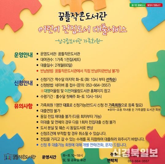 [ 신경북일보 ] 대구 남구는 오는 2월 24일 화요일 10시부터 꿈틀작은도서관에서 ‘전집대출’ 서비스를 운영한다고 밝혔다.