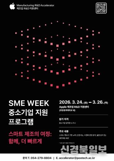 [ 신경북일보 ] 경상북도와 함께 제조 혁신을 추진하고 있는 애플 제조업 R·D 지원센터(포항공과대학교 내)는 오는 3월 24일부터 26일까지 3일간 중소 제조기업을 대상으로 ‘SME Week 중소기업 지원 프로그램’을 개최한다.