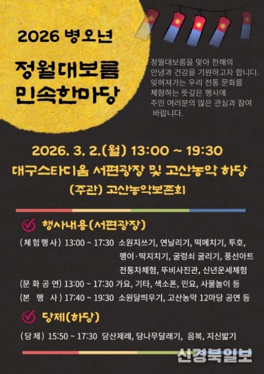 [ 신경북일보 ] 대구 수성구는 2026년 병오년을 맞아 정월대보름을 하루 앞둔 다음 달 2일 대구스타디움 서편광장에서 고산농악보존회 주최·주관으로 구민의 안녕을 기원하는 ‘정월대보름 민속 한마당’을 개최한다.