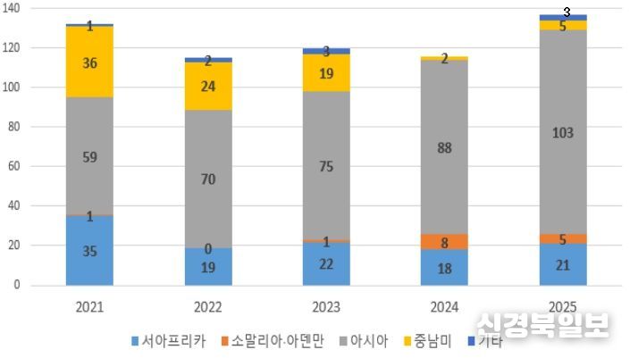 [ 신경북일보 ] 해양수산부는 2월 25일 ‘2025년 전 세계 해적사건 발생 동향’을 발표했다. 2025년 전 세계 해적사건은 2024년보다 증가(116→137건)했으나 승선자 피해는 감소(151→88명)했으며, 우리 국민과 선박에 대한 피해는 발생하지 않았다.